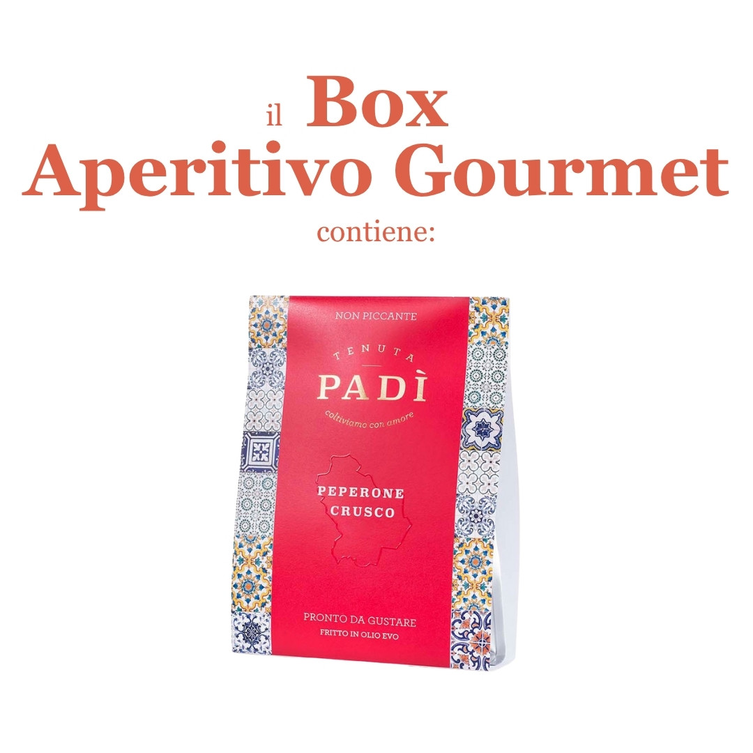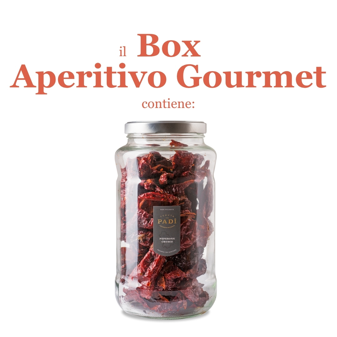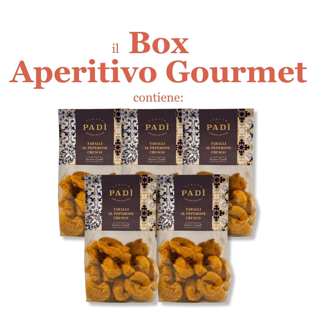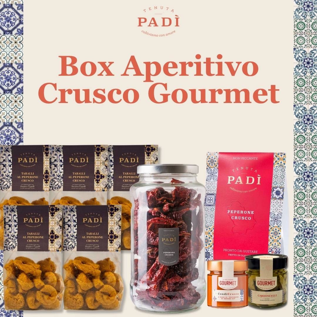 Box Aperitivo Crusco Gourmet Lucano di Tenuta Padì: un mix irresistibile di taralli, funghi cardoncelli, crema spalmabile e peperoni cruschi in tutte le loro varianti.
